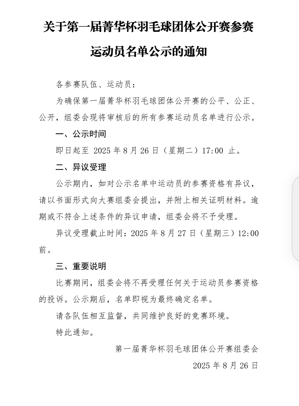 运动员名单公示的通知